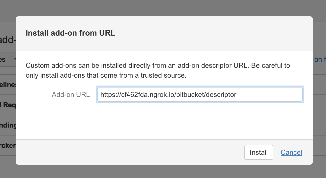 When you go [back to the descriptor]({{ '/2016/05/29/building-bitbucket-add-on-in-rails-part-2/#descriptor' | prepend: site.baseurl | prepend: site.url }}) I created you can see that there's an invalid value for "baseUrl": "example.org"